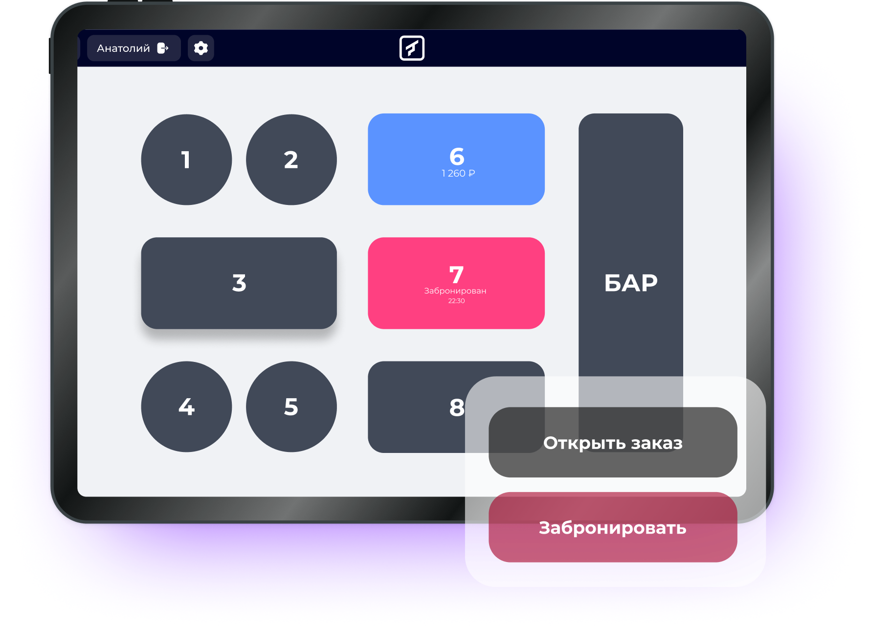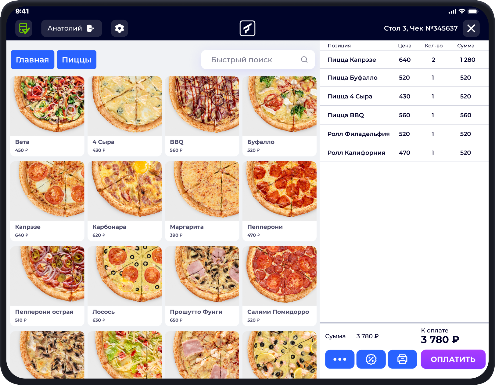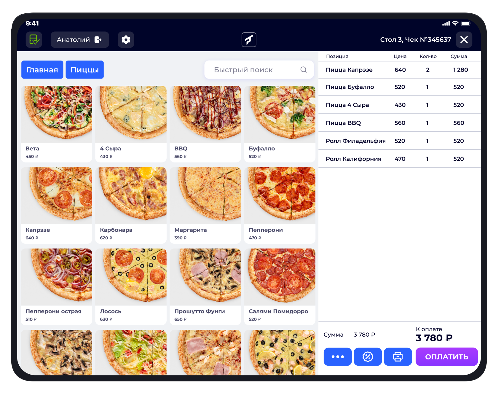 Простое и интуитивное рабочее место официанта на любом устройстве. Принимать заказы теперь удобно: на планшете, ноутбуке и даже со смартфона.