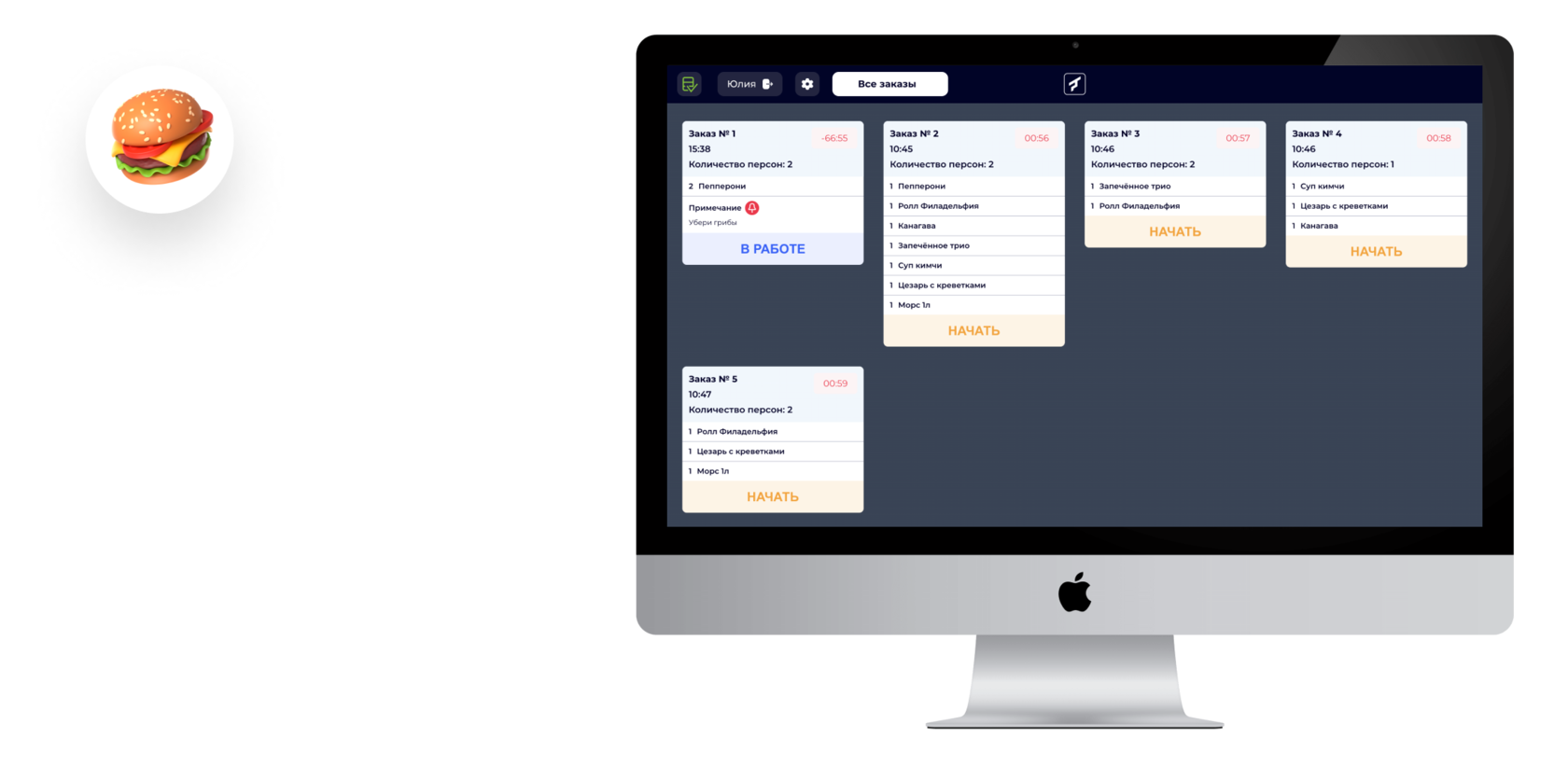 Tachpad сам отправляет заказы на кухню. Так вы сможете сократить время подачи. А табло на кухне поможет забыть про бумажные бегунки и контролировать очередность подачи блюд.